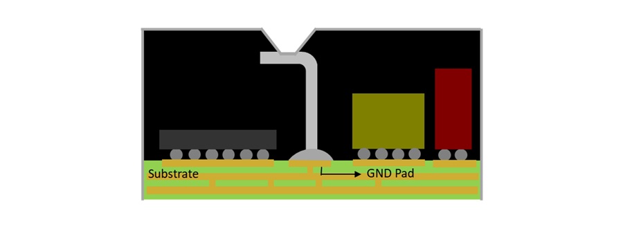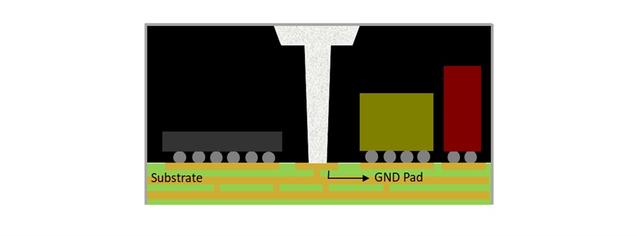 隨著SiP技術(shù)的不斷進(jìn)步,傳統(tǒng)的金屬遮罩(Metal Can)焊接屏蔽方式,因其占用空間大、設(shè)計(jì)靈活性差,只適用於非模具(Non-Mold)產(chǎn)品等缺點(diǎn),已逐漸被淘汰。環(huán)旭電子首創(chuàng)「Trenching & Filling epoxy 隔間屏蔽製程」突破這一限制,為SiP產(chǎn)品的發(fā)展提供有力支持。