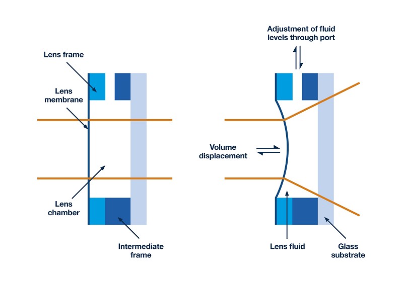 透過在系統中引入液體鏡頭,標準光學系統就可以在幾ms內調整對於飛行物體的聚焦:從無限遠到小於100mm,具體取決於間距。液體鏡頭包含密封在柔性膜內部的光學液體,透過移動膜片或調節光學液體的體積,將鏡頭半徑僅改變幾μm即可達到與使用常規電動聚焦系統使鏡頭變動幾cm的效果。除了更快的聚焦和更簡單的構造(具有更少的運動元件,因此有更少的操作失敗機會)外,液體鏡頭系統還受益於更小慣性和更低功耗。