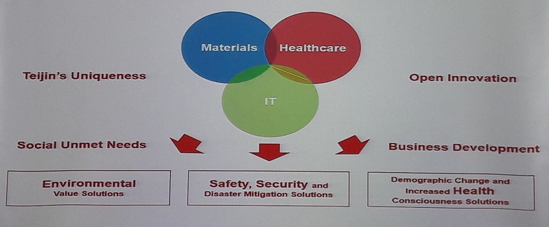 圖1 : 日本帝人(TEIJIN)集團業務組合轉型包括材質、健康和IT三個面向。(source:TEIJIN; 2018/10)